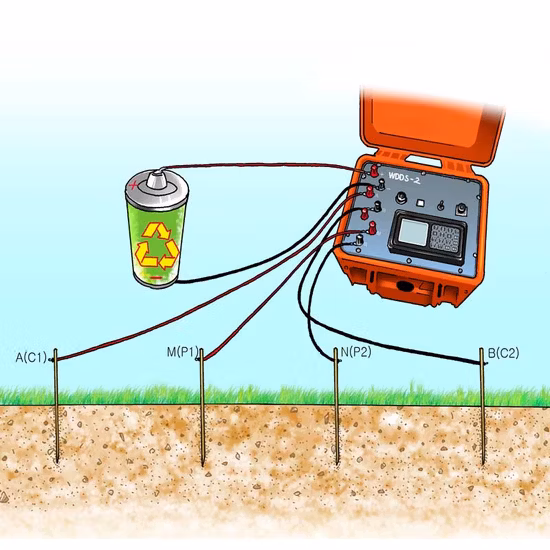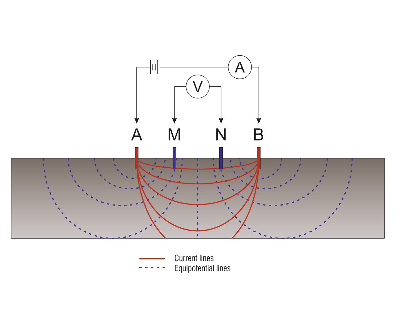 - A controlled electrical current is introduced into the ground through electrodes A and B.